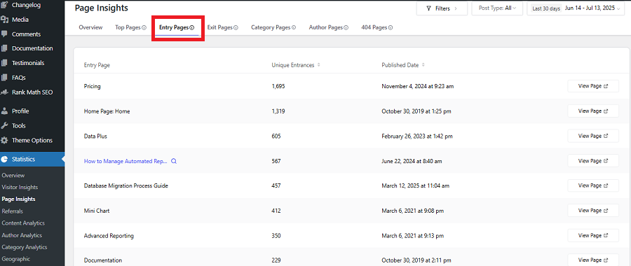 Entry Pages on WP Statistics