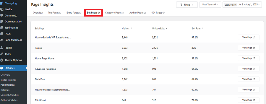 Exit pages on WP Statistics