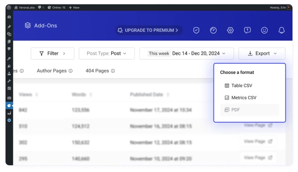 Reports can include metrics such as visitor counts, views, top-performing pages and content, search engine referrals, and author performance. You can select which specific data points you’d like to track.